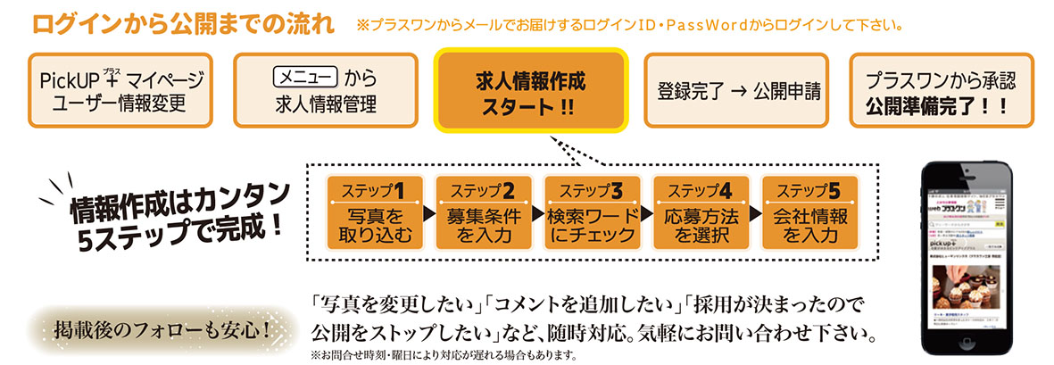 ★トップ画面に表示&検索上位表示。 ★WEBサイトのみの掲載が可能。 ★一週間単位で公開(掲載)のご依頼OK ★WEB応募&問い合わせフォーム機能あり! 「PICKUP+」は読者からの応募・問い合わせをメールで受信出来る エントリーフォーム機能の活用を選択できます。 ★ヒット率向上!仕事探しのこだわり検索機能「えらんで検索」の中でも「勤務条件・特徴」は読者必須の機能の一つ。30以上のボタンの中から該当にチェックすることで閲覧確率が高まります。 ご自分で求人作成~公開申請OK(PC&スマホに対応) ※マイページで新規作成、過去データの確認・編集が可能。 |