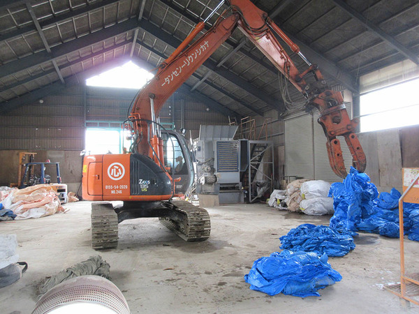 ★処理する廃棄物の種類、量に応じて専用の処理機械を稼働。原料となる廃棄物を機械に投入するのは、重機運転ができるスタッフが行います。処理作業は、主に機械が正常に稼働しているかどうかを目視したり、ちょっとした不具合の調整や人手で行う軽作業が中心になります。