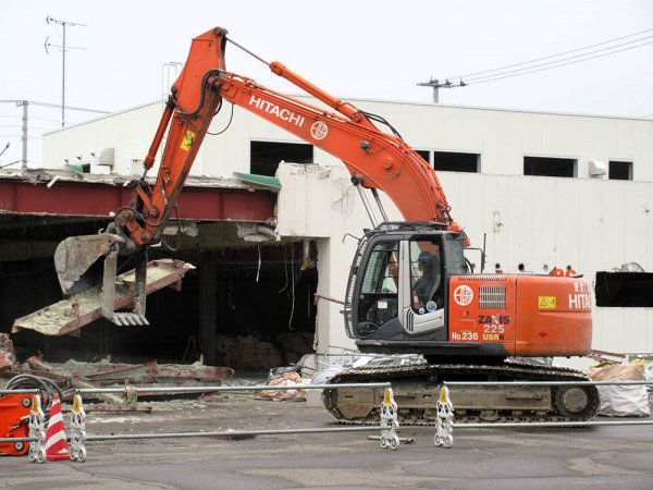 (2)次に重機で建物本体を取り壊しながら、出た廃材を随時ダンプで搬出。