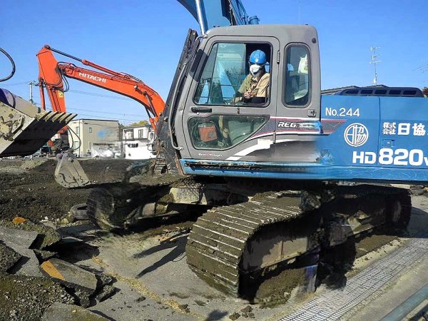 (2)次に、重機で建物本体を取り壊しながら、出た廃材を運搬車両が運んで行きます。